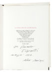 In-4° (mm 348x250). Con, complessivamente, 16 acqueforti di Arturo Carmassi, di cui: 7 a piena pagina nel volume di testo, protette da velina; 1 conservata sciolta entro bifolio protettivo, numerata P.A. e siglata A.C. a matita e una suite di 8 acqueforti sciolte e protette da velina, numerate P.A. e firmate a matita dall'Artista, conservate in una cartella editoriale in piena tela con impressioni al piatto, che si riscontrano solo nel presente esemplare. Difetti ad alcune delle veline, qualche macchiolina marginale ad alcune tavole, altrimenti ottima copia. Il volume di testo si presenta in legatura editoriale in piena pelle, con impressioni dell'Artista a secco al piatto. Il tutto entro cofanetto editoriale in tela, con difetti. Esemplare per Giancarlo Vigorelli, importante critico letterario e giornalista, con la dedica autografa di Carmassi al colophon datata maggio 1973. (1)