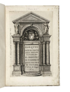 2 parti in 1 volume in-folio (mm 310x205). Carte 24, con 19 calcografie. Frontespizio calcografico. A L1, con proprio frontespizio, l'orazione di Giulio Strozzi con marca xilografica in fine. In barbe. Occasionali macchioline sbiadite. Pieno cartonato marmorizzato. (1) Libro di feste non comune, impresso a ricordo del solenne rito funebre in onore di Cosimo II, deceduto a Firenze il 28 febbraio di quell'anno.