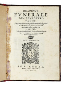 Varchi Benedetto, Orazione funerale [...] recitata [...] pubblicamente nell'essequie di Michelagnolo Buonarroti in Firenze, nella chiesa di San Lorenzo... In Firenze: appresso i Giunti, 1564 (Al colophon:) In Firenze: appresso i Giunti, 1564.