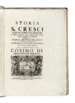 In-folio (mm 380x264). Pagine: [14], XXVII, [3], 180, [2]. Segnatura nella variante B. Illustrato da [8] tavole calcografiche, di cui una ripiegata. Splendida antiporta incisa da Theodor Verkruys su disegno di Tommaso Redi, seguita da frontespizio con emblema calcografico dell'Accademia della Crusca, da ritratto del dedicatario Cosimo III de' Medici (1642-1723), inciso da Arnold Van Westerhout su disegno di Francesco Petrucci, grande testatina calcografica con armi medicee, ed altre testatine e vignette calcografiche. Alcune trascurabili tracce del tempo. Cartonato d'attesa coevo con titoli manoscritti al dorso. (1) Genuino esemplare stampato su carta forte, con incisioni freschissime, di questa opera che narra la vita di San Cresci, primo martire cristiano in Mugello. Cresci fu autore di una serie di guarigioni, grazie alle quali portò molte persone a convertirsi al Cristianesimo. Catturato infine dai soldati romani, fu decapitato e la sua testa infilzata su un'asta per essere portata trionfalmente a Firenze (la splendida antiporta raffigura questa scena in modo molto teatrale). Ma la testa di Cresci divenne così pesante che i soldati romani furono costretti a desistere e a seppellire Cresci ed i suoi sventurati seguaci in quel preciso punto, dove fu poi costruita la Chiesa di San Cresci. La chiesa e i colli circostanti, sono magnificamente ritratti nella tavola ripiegata, incisa da Antonio Lorenzini su disegno di Crescenzio Onofri, che aperta è lunga oltre 73 centimetri.