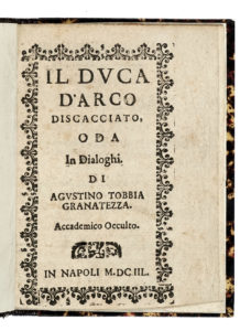 In-8° piccolo (mm 138x97). Carte: [4]. Mezza tela moderna. [SI AGGIUNGE:] Tobbia Granatezza Agostino, Il Duca d'Arco discacciato, Oda In Dialoghi... In Napoli, s.e., 1648 (Al colophon:) li 16 febrario 1648. In-8° piccolo (mm 136x99). Carte: [8]. Frontespizio entro cornice tipografica. Margine inferiore un po' corto. Mezza tela moderna. Sono presenti in entrambi i volumi appunti manoscritti di Tammaro De Marinis. (2) Rarissima coppia di pubblicazioni dedicate a Rodrigo Ponce de León y Álvarez de Toledo duca d'Arcos (1602-1658), nobile spagnolo viceré di Napoli nel turbolento biennio 1646-1648, segnato dalla rivolta capeggiata da Masaniello e dalla proclamazione della Repubblica napoletana, durante la quale i rivoltosi lo obbligarono a ritirarsi a Castel dell'Ovo mettendo una taglia sulla sua testa. Incapace di contenere i tumulti, presentò la sua rinuncia al vice regno e lasciò Napoli il 26 gennaio del 1648. Entrambe le pubblicazioni recano al verso dell'ultima carta un avviso a stampa sottoscritto dal segretario Fabbrani affinché l'opera non venga ristampata per almeno un mese. Tobbia Granatezza dedica la sua opera al Duca di Guisa.