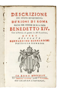 Bernardini Bernardino, Descrizione del nuovo ripartimento de' rioni di Roma fatto per ordine di N.S. papa Benedetto XIV... In Roma: per Generoso Salomone, presso S. Eustachio, 1744.