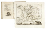 In-8° (mm 175x115). Pagine: [8], 254, [2], 1 carta geografica ripiegata. Frontespizio con stemma xilografico di papa Benedetto XIV e titoli in rosso e nero, titolo di ciascun capitolo in cornice calcografica, testatine e finalini xilografici. Copia genuina con qualche lavorino di tarlo sparso e alcune piccole perdite di testo in particolare alle ultime carte, pallide gore marginali occasionali. Piena pergamena rigida con titoli manoscritti al dorso (leggermente staccato, con lavorini di tarlo e una macchia sul piatto anteriore), tagli spruzzati di rosso. (1) Prima edizione, scritta dal Bernardini, delle nuove disposizioni di Papa Benedetto XIV riguardo il riordino dei confini dei circondari. Esemplare completo della pianta di Roma incisa da Carlo Nolli (1724-1770).