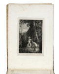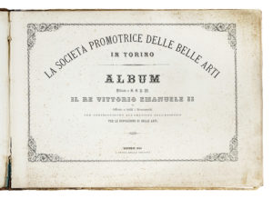 Album in-folio oblungo (mm 306x432). Con 7 incisioni fuori testo, assente la tavola dei "Cervi assaliti dai lupi" di Agostino Lauri: 1 frontespizio inciso da Ferdinando Breme di Sartirana, Cesare della Chiesa di Benevello e I prigionieri di Chillon di Alberto Maso Gilli (Giubbini 2 e 3), La fonte di Ferdinando Breme di Sartirana (Giubbini 8), La pesca di Antonio Fontanesi (Dragone 78), Il torrente di Agostino Lauro (Giubbini 1), Foresta di faggi di Barberis. Pagine inquadrate da graziose conici floreali; tavole corredate delle veline protettive. Fioriture diffuse, che coinvolgono lievemente e marginalmente alcune tavole, blocco di testo un po' slegato. Mezza tela coeva (sciupata). (1) Giubbini n. 7: «Nel 1864 la Promotrice di Torino, come compenso straordinario ai soci che avevano contribuito finanziariamente alla costruzione del nuovo edificio per le esposizioni, pubblicò un album speciale (oltre a quello ordinario) contenente otto incisioni originali e una introduzione di Giovanni Vico [...]. L'album speciale, in effetti, rappresenta il primo riconoscimento ufficiale, in Italia, della dignità e dell'autonomia di opera d'arte dell'acquaforte».