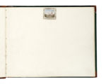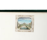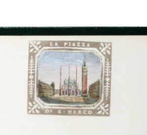 In-8° oblungo (mm 183x230) con frontespizio + [50] carte con piccole vedute di Venezia + [6] carte bianche finali. In mezza pelle coeva con piatti rivestiti in percallina verde (minimi difetti). (1) Curioso album mai utilizzato che reca alla testa di ogni foglio una vedutina di Venezia impressa calcograficamente e colorata a mano, ciascuna entro una cornicetta grigia con didascalia e decorazioni floreali bianche in rilievo. Molto ben conservato.