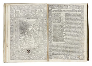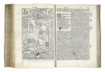 In-folio (mm 305x210). Carte: [10], CCXCIX, [1]. Testo in carattere romano in corpo più grande per il Poema, più piccolo per il commento. Con 3 grandi xilografie all'inizio di ciascuna cantica, quella dell'Inferno e la pagina antistante entro belle bordure figurate, la prima identica a quella presente nell'edizione del 1491, la seconda creata appositamente per quest'edizione del 1493; e con 97 vignette xilografiche nel testo. Aloni marginali e macchiette alle prime e (più forti) alle ultime carte, un forellino di tarlo da a1 a b6, qualche strappetto marginale, un difettino della carta alla carta XXXII, alone marginale alla carta CXVIII, pallida gora intermittente al margine superiore, margine della carta CLXXXV risarcito senza perdite, qualche carta pallidamente arrossata, un paio di forellini all'ultima carta, che ha il margine interno rinforzato, antica firma di appartenenza "Francisci del Bene et amicorum" ai frontespizi e in fine, timbro moderno di collezione privata austriaca al contropiatto posteriore, ma nel complesso buona copia completa in legatura moderna realizzata con frammento di pergamena manoscritta da antico antifonario, tagli spruzzati d'azzurro. (1) Rarissima a trovarsi completa questa splendida edizione illustrata della Commedia, con le figure che illustrano tutto il testo del Paradiso; «È giudicata la più bella fra le edizioni figurate della D.C. fatte a Venezia nel sec. XV; si avvantaggia su quella del 1491 per la più ricca decorazione e sull'altra del 1497 per la esecuzione tipografica e la freschezza dei legni» (Mambelli 15). Seconda edizione della Commedia stampata da Matteo Capcasa, con il commento del Landino rivisto da Pietro da Figino (padre Mazzanti da Figline); sullo stampatore si veda De Batines I, 55-57: «Affò [...] opinò che sotto i vari nomi di Matteo da Parma, Matteo Capocasa e Matteo de Chodeca si stia veramente un solo e medesimo stampatore, lo che nega il Pezzana sostenendo che M. Capocasa e Giovanni di Matteo da Parma sono due ben distinti stampatori». Precedono il testo un'Apologia e la Vita di Dante, e lo seguono il Credo, i Dieci Comandamenti, i Sette peccati capitali, il Pater Noster e l'Ave Maria ridotti in terze rime e attribuiti a Dante. BMC V, 484; Essling 533; Goff D-34; GW 7971; Hain 5951; IGI 365; Proctor 4996; Sander 2315.
