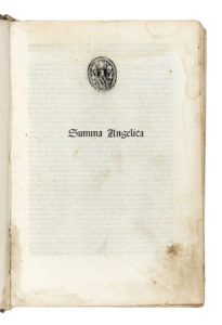 In-8 (mm 170x117). Carte: [8], 519, [1], 12. Testo in gotico su due colonne. Grande marca Arrivabene in fine. Qualche pallida gora marginale ma nel complesso copia molto buona in piena pelle coeva decorata a secco su assicelle di legno, contropiatti rivestiti con frammenti di antica pergamena manoscritta, resti di fermagli metallici (difetti). Piccolo timbro nobiliare al frontespizio. (1) Rara edizione Arrivabene (successiva a quella più comune da lui impressa nel 1492) di questo popolare manuale di teologia morale, con oltre 600 voci in ordine alfabetico. ISTCia00726000; Goff A726; H 5398*; GW 1939.