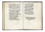 In-4° (mm 205x138). Carte: [41, di 42, assente una carta nel quaderno c]. Testo in romano con due iniziali xilografiche. Mancanza risarcita all'angolo superiore interno (minime perdite di lettere), per il resto buona copia in elegante vitellino moderno in stile, riccamente decorato a secco. (1) Rarissima edizione incunabola della vita di Castruccio Castracani, registrata da ISTC in solo 19 istituzioni nel mondo (di cui una decina in Italia), importante per il confronto con la Vita di Castruccio Castracani, scritta dal Machiavelli nel 1520. Le carte 41a-42a presentano versi in latino e italiano di vari scrittori, tra cui lo stesso Tegrimi, dedicati a Castruccio e alla sua effigie a Lucca. Uomo politico e umanista, Niccolò Tegrimi (1448-1527), appartenne a una delle famiglie più in vista di Lucca. La sua fama di scrittore è principalmente legata a questa "pregevole biografia latina del condottiero e signore lucchese Castruccio Castracani" (treccani.it) più volte ristampata, e oggetto di confronto con la Vita di Castruccio Castracani, scritta dal Machiavelli nell'estate del 1520 a Lucca. "Difficile pensare che M. ... non fosse venuto a conoscenza dello scritto di T.: non soltanto esso era disponibile a stampa, ma l'autore, come si è visto, era in città personaggio assai in vista. Tra il Castruccio machiavelliano e la biografia di T. esistono peraltro molti riscontri oggettivi, anche se le sistematiche alterazioni storiche introdotte da M. ci indicano come l'opera dell'umanista e giurista lucchese gli fornì molti spunti, ma non una traccia narrativa. Il Castruccio rivela infatti una libera e capricciosa reinvenzione dei dati storici e della cronologia, arrivando a presentare (per limitarci ai casi più eclatanti) il suo eroe come un bambino abbandonato, casualmente trovato in una vigna dalla sorella del canonico di S. Michele, l'immaginario Antonio Castracani, che lo adottò (§ 7-13); mentre Castruccio – come si legge in T. – nacque nella casa del padre («aedibus paternis»), Geri Castracani, della nobile famiglia degli Antelminelli. Né meno vistosa è la decisione machiavelliana di presentarlo come scapolo e senza figli (§ 135), contraddicendo T., che parla della moglie e dei nove figli del condottiero." (treccani.it) Castruccio Castracani degli Antelminelli (1281-1328) è stato un militare e politico italiano, duca di Lucca e gonfaloniere del Sacro Romano Impero. ISTC it00566000; IGI 9672; Goff T566; BMC VII 1063; GW M45298.