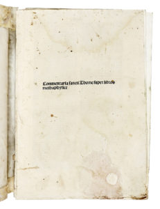 Tommaso d'Aquino (santo), [Interpretatio in Metaphysicam Aristotelis] Commentaria sancti Thome super libros methaphysice. (Al colophon:) Impressum fuit hoc opus Venetiis: per Simonem Beuilaquam Papiensem, 1493. die. xx. decembris.