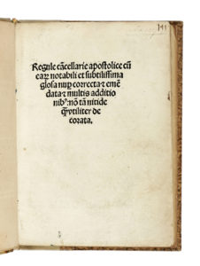 Regule cancellarie apostolice cum earum notabili et notabili et subtilissima glosa nuper correcta et emendata et multis additionibus non tam nitide quam utiliter decorata. (Al colophon:) [Lione]: Nicolaum Wolff, 1501.