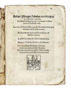 Aesopus, Aesopi Phrygis Fabulae: 208 e graeco in latinum conversae. Eiusdem Fabulae 33 per Laurentium Vallam [...] versae... [(Al colophon:) Impressum Venetiis: per Ioannem de Tridino alias Tacuinum, 1513. die XX. Octobris].