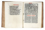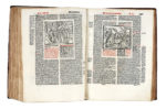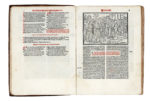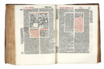 In-4° (mm 208x152) in 5 parti, ciascuna delle quali inizia con proprio frontespizio dove compaiono i nomi dei relativi commentatori. Carte: CCLXXXVIII, CXX, LXIIII, LXIIII, XI, [1 bianca]. Giglio Giunta ai frontespizi, testo in gotico su più colonne stampato in rosso e nero, 2 illustrazioni xilografiche a piena pagina e numerose vignette xilografiche nel testo. Tracce d'uso al primo frontespizio, strappetti con minime perdite alla carta clxx della prima parte, e altre trascurabili tracce del tempo, ma nel complesso bellissima copia completa in legatura coeva in piena pelle riccamente decorata a secco e con armi della famiglia fiorentina degli Alberti, tagli dorati e goffrati (difetti al dorso). (1) Il Liber Sextus, facente parte del Corpus Iuris Canonici, è una raccolta di norme di diritto canonico promulgata con la bolla sacrosanctae Romanae Ecclesiae il 3 marzo 1298 da Papa Bonifacio VIII per integrare il Liber Extra con le nuove norme canoniche emanate dal 1234. Essling 1814 e 1816. Sander I, 1215 e 2002.