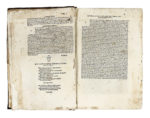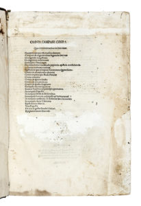 In-folio (mm 303 x 200). Carte: CXVIII, [6], LXXXIIII, [2], LVIII, [4], XXVI, [1]. Assenti p2-3 ee2, ee5-6. Lavori di tarlo, restauri al frontespizio, fascicolo ee sciolto e altri difetti. Piena pelle settecentesca, tagli spruzzati d'azzurro. (1) Seconda edizione (dopo la prima del 1495) delle opere del Campano. ISTC ic00074000; Goff C74; HC 4285*; BMC(It) p.141; GW VI Sp.79a.