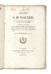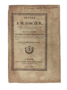 Champollion Jean François, Lettre a m. Dacier, secretaire perpetuel de l'Academie Royale des inscription et belles-lettres, relative a l'alphabet des hieroglyphes phonetiques employes par les egiptiens... A Paris: chez Firmin Didot pere et fils, 1822.