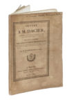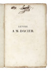 In-8° grande (mm 238x157). Pagine: [4], 52 + [4] tavole ripiegate in fine. Pallide fioriture occasionali ma nel complesso ottima copia completa e in barbe, nella sua brossura editoriale (minimi difetti) con dedica autografa di Champollion "A Monsieur Langlès hommage de l'auteur" al margine superiore, e con firma autografa di Louis-Mathieu Langlès all'occhiello, datata 1822. Conservato entro scatola moderna rivestita in tela rossa (mm 265x172). (1) Prima edizione della prima esposizione di Jean-François Champollion (1790-1832), archeologo ed egittologo francese, del suo metodo per decifrare i geroglifici egizi. In esso egli annuncia la sua assegnazione di valori fonetici a 12 geroglifici e la sua associazione provvisoria di 40 segni geroglifici con i suoni fonetici di 17 lettere greche. Le quattro tavole ripiegate in fine, incise da disegni originali di Champollion (che si firmò in geroglifici), sono costituite da cartigli geroglifici e iscrizioni demotiche, e da una tavola di simboli che Champollion aveva identificato come fonetici. Da queste ricerche iniziali, Champollion fu in grado di progredire verso una decifrazione più completa, rendendo così i testi dell'antico Egitto accessibili ai suoi contemporanei e fondando l'egittologia moderna. Con l'aiuto della Stele di Rosetta, caratterizzata da un testo trilingue (geroglifici, demotico, greco), e di altri monumenti e documenti riportati dall'Egitto da esploratori e scienziati francesi e britannici, Champollion maturò le sue ipotesi fino alla rivelazione finale, che comunicò in una memoria indirizzata nel settembre 1822 alla Académie des Inscriptions et Belles-Lettres. Leggermente rivista, la memoria fu pubblicata da Firmin Didot il mese successivo, con il titolo Lettre à M. Dacier. La presente copia è ulteriormente arricchita da una provenienza importante: appartenne a Louis-Mathieu Langlès (1763-1824), accademico linguista francese nonché conservatore dei manoscritti orientali presso la Bibliothèque Nationale. Sia Champollion, sia Langlès, sono sepolti al Père-Lachaise. Blackmer, 306; L'Aventure Champollion, Paris, BnF, 2022.