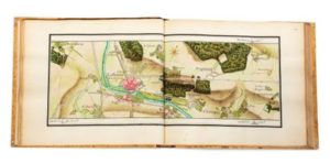 CARTES. — Route de Paris à Strasbourg. S.l.n.d. [seconde moitié du XVIIIe siècle]. Manuscrit in-4 oblong, demi-maroquin rouge avec petits coins de vélin, pièce de titre de maroquin rouge sur le premier plat, dos lisse orné à la grotesque (Reliure moderne dans le goût ancien). Très beau manuscrit de 93 plans et cartes très finement aquarellés, détaillant l'itinéraire de Paris à Strasbourg. L'itinéraire suivi passe par les villes de Meaux, La Ferté sous Jouarre, Château-Thiéry, Verdun, Metz, Sarrebourg, Phalsbourg, etc. Figurent également des itinéraires reliant Strasbourg à différentes villes comme Huningue, Belfort (mal orthographiée Betfort), Landau, avec des étapes à Sélestat, Colmar, Neubrisac (Neuf-Brisach), Fort-Louis, Lauterbourg et Haguenau.