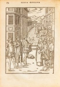 DAMHOUDÈRE (Josse de). Praxis rerum civilium, praetoribus, propraetoribus, consulibus, proconsulibus, magistratibus id genus justituariis ac officiariis... Anvers, Jean Bellère, 1567. In-4, basane granitée, dos orné, tranches mouchetées de rouge (Reliure du XVIIe siècle). Édition originale ornée de 16 gravures sur bois, la plupart à pleine page, de ce manuel judiciaire pour les procédures civiles, complément de l'autre grand traité de l'auteur, le Praxis rerum criminalium (1554). Jurisconsulte flamand, Josse de Damhoudère (1507-1581) fut le conseiller des finances de Charles-Quint et de Philippe II pendant plus de 30 ans. Ex-libris manuscrits sur le titre, dont certains rayés, et ex-libris manuscrit d'un docteur en droit daté 1702 au bas d'un feuillet liminaire. Quelques soulignés anciens. Mouillures claires et rousseurs à quelques feuillets. Petits trous de vers dans le fond de plusieurs feuillets. Petits frottements à la reliure (charnières et coins).
