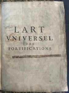 [DU BREUIL (Jean)]. L'Art universel des fortifications, françoises, hollandoises, espagnoles, italiennes, et composées. Paris, Jacques Du Brueil père et fils, 1665. In-4, vélin (Reliure de l'époque). Édition originale, ornée d'un frontispice, de 4 figures à pleine page gravés sur cuivre par Le Pautre, et de nombreuses gravures sur cuivre (figures géométriques et plans de fortifications) comprises dans la pagination. (Marini, pp. 108-109.) Ex-libris manuscrit ancien, biffé, sur le faux-titre qui est sali. Mouillure et salissures à quelques feuillets. Petite restauration aux 4 premiers feuillets et au vélin.