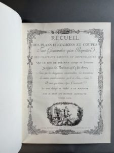 HÉRÉ (Emmanuel). Recueil de Héré. Paris, Léonce Laget, 1979. Grand in-folio, maroquin rouge, large dentelle dorée, dos orné, pièce de titre verte, dentelle intérieure, tranches dorées (Reliure pastiche moderne). Réimpression en fac-similé des 82 planches du très beau et rare Recueil de Héré (1752-1753), avec une préface de l'abbé Jacques Choux, conservateur du Musée lorrain à Nancy, et des notes explicatives. Tirage à 300 exemplaires numérotés : celui-ci exemplaire de l'éditeur (n°1), justifié au crayon Exemplaire de Léonce Laget relié par Marc Ollivier (1980). Dos insolé, épidermures.