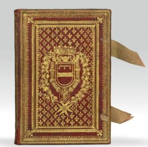 MONTIGNY (Louis de). Vita di S. Eligio vescovo di Noion. Rome, Andrea Fei, 1629. In-4, maroquin rouge, jeu de filets et de roulettes dessinant un double encadrement avec petite fleur de lis aux angles, le panneau central ainsi formé orné au centre de grandes armoiries et chargé d'un semé de fleurs de lis, restes de rubans de soie, dos lisse orné, tranches dorées (Reliure italienne de l'époque). Première édition en italien de cette vie de saint Éloi de Noyon (588-659), qui fut initialement rédigée en latin par l'un de ses contemporains, saint Ouen, évêque de Rouen. La traduction, due à Giorgio Gucmanno, a été faite sur la version française donnée par Louis de Montigny, chanoine et archidiacre de la cité épiscopale noyonnaise. Très beau frontispice gravé en taille-douce par Claude Mellan, représentant le portrait sculpté en buste de saint Éloi au centre d'un riche cartouche baroque. Exemplaire de dédicace aux armes de Philippe de Béthune (1565-1649), ambassadeur à Rome auprès du pape Urbain VIII, dans une riche reliure romaine de l'époque. Frère de Maximilien de Béthune, duc de Sully, le célèbre surintendant des Finances, ce diplomate et homme de guerre ne possédait au début du XVIIe siècle qu'une centaine de volumes, notamment des livres d'architecture et d'art militaire, mais constitua par la suite une collection considérable de documents historiques à la mesure de ses responsabilités officielles (cf. Histoire des bibliothèques françaises, t. II, p. 235). L'exemplaire a figuré au catalogue de la librairie Georges Heilbrun, Livres ayant appartenu à des Amateurs célèbres, n°27. Il est préservé dans une boîte de maroquin noir à fenêtre transparente. Quelques légères rousseurs, trace de mouillure à plusieurs cahiers nettement visible aux cahiers Y, Aa à Dd et Gg-Hh. Restauration aux coiffes, mors et coins.
