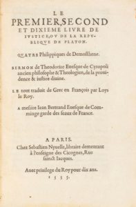 PLATON. Le Premier, second et dixième livre de justice, ou De la république. Quatre Philippiques de Démosthène. Sermon de Théodorite. Paris, Sébastien Nivelle, 1555. In-4, veau retourné, double encadrement de trois filets à froid, fleuron aux angles, dos à trois nerfs soulignés de filets à froid (Reliure moderne dans le goût ancien). Édition originale de la première traduction française de ces trois livres de Platon. Elle a été donnée par Loys Le Roy (1510-1577), dit Regius, professeur de langue grecque au Collège royal et l'un des meilleurs hellénistes de son temps. Ce dernier y a adjoint deux textes dont la thématique est proche : les Philippiques de Démosthène et une œuvre de Théodorite, évêque de Cyr en Syrie au Ve siècle. Exemplaire lavé. Restauration angulaire aux 4 derniers feuillets.