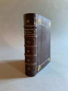 PUTEO (Paris de). De sindicatu, libri duo. S.l.n.d. [au colophon] : Lyon, Jean Flajollet, 1539-1540. 3 parties en un volume in-8, maroquin brun, double encadrement de filets à froid, fleuron doré aux angles, dos orné, dentelle intérieure, tranches dorées sur marbrure (Hardy). Très rare édition gothique lyonnaise du Tractatus de syndicatu de Paris de Puteo (ou del Pozzo), jurisconsulte italien né vers 1413 et mort en 1493, qui occupa une chaire de droit à Naples et qui fut notamment chargé de l'éducation du duc de Calabre, le futur Ferdinand Ier roi de Naples. (Baudrier, t. VI, pp. 189-190, et t. XII, pp. 434.) Elle a été imprimée par Jean Flajollet (Flaioletus en latin) pour Jacques Giunta, membre de la grande dynastie italienne du même nom et établi à Lyon comme libraire dans la première moitié du XVIe siècle. Impression en caractères gothiques à longues lignes ; titres placés dans un encadrement gravé, les deux premiers ornés d'une marque typographique répertoriée par Silvestre n°448 comme étant celle de Giunta. Un seul exemplaire de cette édition est signalé dans le CCFr (Lyon). Inscription à la plume sur le titre général : C. Colmar s. u. d. (?). La troisième partie est mal reliée avant la seconde. Le feuillet CLXVIII (x8), blanc, n'a pas été conservé. Petite mouillure brune en tête des derniers cahiers du volume. Éraflures à la reliure.