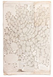 ROTH (Chrétien Frédéric Guillaume). Essai d'une distribution généalogique des Sciences et des Arts Principaux. Selon l'Explication détaillée du Système des Connoissances Humaines dans le Dicours préliminaire des Editeurs de l'Encyclopédie, publiée par M. Diderot et M. D'Alembert à Paris, en 1751. Reduit en cette forme pour découvrir la Connoissance Humaine d'un coup d'oeil, Par Chrétien Fréderic Guillaume Roth, Weimar, 1769. [Weimar, 1769]. Grande planche in-plano. Très rare tableau gravé, de grandes dimensions, représentant l'arbre généalogique des arts et des sciences sur lequel se fondait le projet intellectuel de l'Encyclopédie. Fervent admirateur de cette entreprise, Chrétien Fréderic Roth avait voulu condenser sous cette forme visuelle spectaculaire, l'ensemble des connaissances qui s'articulaient dans l'ouvrage de Diderot et D'Alembert. Trois ans plus tard, il publia à Weimar, chez Hoffmann, un petit volume de 32 pages tiré à un petit nombre d'exemplaires reproduisant une partie du discours préliminaire de l'Encyclopédie, pour servir à l'usage de l'Arbre Encyclopédique. Exemplaire replié en quatre.
