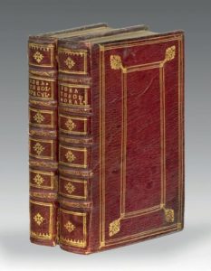 SAINT-JOSEPH (Pierre de). Idea theologiae moralis [...]. Editio III. — Idea theologiae speculative [...]. Editio V. Paris, Georges Josse, 1642-1643. 2 volumes in-12, maroquin rouge, plats ornés d'un décor à la Du Seuil, dos orné, tranches dorées (Reliure de l'époque). Éditions ornées de 2 frontispices gravés sur cuivre par Jean Picart, dédiées respectivement à l'abbé Charles de Saint-Paul et au cardinal de Richelieu. Né à Auch, Pierre de Saint-Joseph (1594-1662), de l'ordre des Feuillants, est l'auteur de nombreux traités de théologie et de philosophie. Il a été l'une des sources principales d'Anton Wilhelm Amo (vers 1700-1753), le philosophe noir des Lumières, premier Africain diplômé en Europe, pour la rédaction de son Treatise on the Art of Soberly and Accurately Philosophizing (1738) (cf. Justin E. Smith in Neglected Classics of Philosophy, vol. II, pp. 124-128). Très plaisant exemplaire, réglé, en maroquin d'époque. Une charnière légèrement marquée, petit éclat restauré à une coiffe.