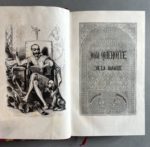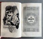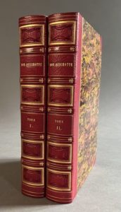 CERVANTÈS (Miguel de). L'Ingénieux Hidalgo Don Quichotte de la Manche. Traduit et annoté par Louis Viardot. Paris, Dubochet et Cie, 1836-1837. 2 volumes in-8, demi-maroquin rouge avec coins, dos orné, tranches mouchetées (Reliure de l'époque). Premier tirage. 2 frontispices tirés sur chine, dont le portrait de Don Quichotte (ici avec moustache) et 800 vignettes dans le texte gravés d'après Tony Johannot, plus un faux-titre orné sur vélin blanc, gravé par Best et Leloir. Très bel exemplaire, dans une élégante et fraîche reliure de l'époque. Quelques cahiers légèrement brunis.