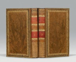 CHATEAUBRIAND (François-René de). Les Martyrs ou Le Triomphe de la religion chrétienne. Paris, Le Normant, 1809. 2 volumes in-8, veau raciné, dentelle dorée formée de filets et de deux roulettes dont l'une de forme festonnée et l'autre poussée sur un cadre de veau brun, dos lisse orné, pièces de titre et de tomaison rouges, tranches jaunes mouchetées de bleu (Beguin relieur). Édition originale. Très rare en reliure de qualité, celle-ci porte une signature non répertoriée. Bien complet du feuillet d'errata et des 10 pages du catalogue de l'éditeur. Cachet humide du diocèse d'Orléans sur le titre. Petite restauration à la coiffe supérieure du tome I.