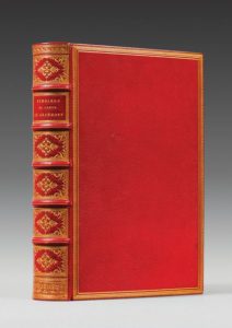 HAMILTON. Mémoires du comte de Grammont. Paris, L. Conquet, 1888. Grand in-8, maroquin rouge, triple filet et dent de rat en encadrement, dos orné, dentelle intérieure, tranches dorées, non rogné, couverture (Cuzin). Édition de grand luxe, ornée d›un portrait de l›auteur et de 33 compositions de Charles Delort gravées au burin et à l'eau-forte par Léon Boisson. Un des 200 exemplaires de grand choix, celui-ci sur papier vélin du Marais contenant un tirage à part des illustrations. Très bel exemplaire en reliure de qualité de Cuzin.