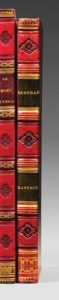 MATURIN (Charles-Robert). Bertram, ou Le Château de Saint-Aldobrand, tragédie en cinq actes. Traduite librement de l'anglais par MM. Taylor et Ch. Nodier. Paris, Gide fils, Ladvocat, 1821. In-8, demi-veau cerise, dos orné de filets dorés et de fleurons et filets à froid, tranches mouchetées (Reliure de l'époque). Édition originale. Charles-Robert Maturin, romancier et dramaturge, vicaire de l'église anglicane de Saint-Pierre à Dublin, fut le dernier représentant anglais de « l'école de la terreur », initiée par Walpole, Radcliffe et Lewis. Les traducteurs, dans leur préface, parlent de Bertram comme d'un drame effrayant, une digne production du génie morose et farouche, et ajoutent : Ce qu'il y a de déplorable, c'est que cette tragédie angloise est horriblement belle, et si l'on peut s'exprimer ainsi, qu'elle est horriblement morale ; car on ne peut pas se plaindre que le crime n'y reçoive pas sa punition. Cette préface compte parmi les premiers manifestes du genre romantique. Longue note biographique de l'époque sur l'auteur, copiée d'une lettre de lord Byron, sur le premier feuillet de garde.