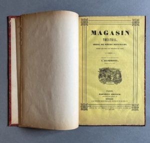NERVAL (Gérard de) et Alexandre DUMAS. L'Alchimiste, drame en cinq actes, magazine théâtral. Paris, Marchand; Bruxelles, À la librairie belge-française, 1839. Grand in-8, demi-percaline marbrée, dos de maroquin noir à long grain, couverture (Reliure de la fin du XIXe siècle). Édition pré-originale, publiée la même année que l'originale parue chez Dumont. Le texte n'est pas repris dans les œuvres complètes de Nerval de Michel Lévy, mais dans le Théâtre de Dumas. La couverture jaune donne le catalogue détaillé des 24 volumes du magazine théâtral.