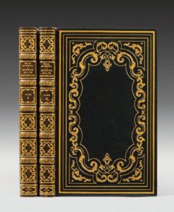 NERVAL (Gérard de). Scènes de la vie orientale. Les Femmes du Caire. Paris, Fernand Sartorius, 1848. In-8, demi-maroquin brun à long grain avec coins, filet doré, dos orné de caissons dorés et mosaïqués, non rogné, couverture et dos (Stroobants). — Scènes de la vie orientale. I. Les Femmes du Caire. - II. Les Femmes du Liban. Paris, Hippolyte Souverain, 1850. 2 volumes in-8, maroquin vert à long grain, décor de filets dorés droits et courbes, gros fers rocaille, dos orné, bordure intérieure, doublure et gardes de soie moirée saumon, tranches dorées, non rogné, couverture, étui (G. Mercier rel. 1939/E. & A. Maylander dor. 1943). Ensemble 3 volumes. Éditions originales, d'une grande rareté. Gérard de Nerval entreprit en janvier-décembre 1843 un voyage en Orient, au cours duquel il visita Alexandrie, Le Caire, Beyrouth, Chypre, Rhodes, Smyrne, Constantinople, Malte et Naples. Dans une lettre adressée au docteur Étienne Labrunie le 25 décembre 1842, il avait ainsi exprimé son besoin d'évasion : L'hiver dernier a été pour moi déplorable, l'abattement m'ôtait les forces, l'ennui du peu que je faisais me gagnait de plus en plus et le sentiment de ne pouvoir exciter que la pitié à la suite de ma terrible maladie m'ôtait même le plaisir de la société. Il fallait sortir de là par une grande entreprise qui effaçât le souvenir de tout cela.