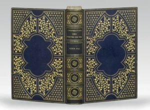 NODIER (Charles). Journal de l'expédition des Portes de fer. Paris, Imprimerie royale, 1844. Grand in-8, maroquin bleu foncé, triple filet doré, grand décor de huit compartiments dessinés par des doubles filets et ornés de semés de fleurs de lis ou de branchages d'olivier, le tout agencé autour d'un grand compartiment polylobé en réserve, dos orné de caissons fleurdelisés compartimentés et décorés de semés de fleurs de lis, doublure de maroquin rouge orné d'une large dentelle dorée aux petits fers, dans les angles fleurs de lis dans un cartouche, tranches dorées (Chambolle-Duru - Marius Michel doreur). Édition originale, imprimée sur papier vélin, de l'un des beaux livres du XIXe siècle consacrés à la conquête de l'Algérie. 40 figures hors-texte gravées sur bois et tirées sur chine monté, sous serpente légendée, et nombreuses vignettes dans le texte, en premier tirage. Une carte dépliante est placée à la fin du volume. Spectaculaire et parfaite reliure à compartiments signée Chambolle-Duru ; elle est également signée du doreur, Marius Michel (le père). Un autre exemplaire de cette édition, dans une reliure semblable (non doublée) exécutée par Hippolyte Duru en 1856, a figuré dans la bibliothèque Henri Lafond (2015, n°130). Ex-libris gravé (collé au milieu de la doublure) de Freiherr Maximilian von Goldschmied Rothschild. Au verso du titre, cachet de restitution de la bibliothèque de Frankfort. Petite restauration et petit enfoncement au centre du plat supérieur.