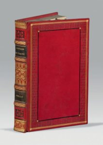 VIGNY (Alfred de). Les Consultations du Docteur-Noir. Stello ou Les Diables Bleus (Blue devils). Paris, Gosselin, Renduel, 1832. In-8, veau cerise, large roulette à froid cernée d'un triple filet doré et d'un filet gras noir, dos orné de roulettes dorées et de gros fers noirs, pièces de titre et de tomaison vertes, tranches marbrées, étui moderne (Reliure de l'époque). Édition originale, ornée de 3 figures sur chine de Tony Johannot gravées par Brévière. Ce réquisitoire contre la société bourgeoise fut fortement influencé par les déceptions personnelles de l'auteur. Le grand thème des trois histoires de Gilbert, Chatterton et Chénier, est le sort injuste du poète dans la Société. En faisant dialoguer Stello et le Docteur Noir, Vigny oppose deux aspects de sa propre personnalité (cf. Alfred de Vigny, catalogue de l'exposition à la Bibliothèque nationale, 1963, p. 44). Exemplaire de choix dans une élégante reliure en veau cerise. La reliure, de qualité, n'est pas signée. Ex-libris armorié gravé de la comtesse de Vaudreuil, femme du gouverneur du Louvre.