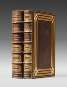 VIGNY (Alfred de). Servitude et grandeur militaires. Paris, Édouard Pelletan, 1898. 2 volumes in-8, maroquin aubergine, large encadrement composé de trois jeux de cinq filets dorés entrecroisés aux angles, dos orné de jeux de filets dorés, encadrement intérieur orné d'un jeu de quatre filets et filets perlés, doublure et gardes de soie brochée gris clair, tranches dorées sur témoins, couverture et dos, étuis (P. Ruban, 1892). 51 et 84 illustrations de Louis Dunki, gravées sur bois par Clément Bellenger. Tirage à 350 exemplaires, celui-ci comportant une suite sur chine de tous les bois. Quelques rares piqûres sur les tranches et sur un feuillet. Dos très légèrement passé.