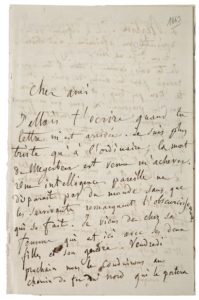 BERLIOZ (Hector). 3/4mai 1864. Lettre autographe signée à son fils Louis Berlioz [Paris. 3-4 mai 1864). Gp. in-8. Trace d'onglet. Belle et longue lettre dans laquelle il évoque la mort Meyerbeer, de Rossini, de Beethoven, etc.... La mort de Meyerbeer est venue m'achever. Une intelligence pareille ne disparait pas du monde sans que les survivants remarquent l'obscurcissement qui se fait.... Lundi dernier je suis allé à notre diner hebdomadaire : il y a beaucoup été question de Meyerbeer et de Rossini et nous avons dit à propos de ces deux hommes des choses que je crois vraies : l'un était un artiste, égoïste sans doute, l'autre est un égoïste qui n'est pas artiste. Fiorentino, quoiqu'Italien, a le premier soutenu cette thèse, et je me suis soulagé le cœur à la développer.” ...J'ai eu beau écrire trois fois à Mr. Richard Pohl, qui avait entrepris la traduction allemande des Troyens, je n'ai pu obtenir de réponse : ce qu'il y a de plus fort, c'est que l'Éditeur de Leipzig de la nouvelle édition de mon Traité d'instrumentation qui devait me compter cent thalers à Pâques ne veut pas me répondre non plus, ni par conséquent me payer...