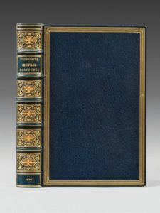 BAUDELAIRE (Charles). Œuvres posthumes. Paris, Société du Mercure de France, 1908. In-8, maroquin bleu, encadrement d'un jeu de cinq filets dorés, dos orné, dentelle intérieure, tête dorée, à toutes marges, couverture et dos (Vermorel). Édition en partie originale, comprenant pour la première fois les articles du Corsaire-Satan et de Paris-Journal. Un des 87 exemplaires sur hollande réimposés de format in-8 avec le portrait de Baudelaire gravé sur bois en deux états en noir et en sanguine. Très bel exemplaire malgré les coins un peu ouverts.