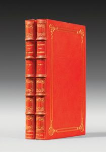 FLAUBERT (Gustave). Salammbô. Préface par Léon Hennique. Paris, Ferroud, 1900. 2 volumes grand in-8, maroquin orangé, bordure dorée en encadrement ornée de deux doubles filets d'entrelaçant et réunis aux angles autour d'un médaillon circulaire, dos orné, dentelle intérieure, tranches dorées sur témoins, couverture et dos (Joly fils). Compositions de Georges Rochegrosse gravées à l'eau-forte par Champollion. Un des exemplaires sur vélin d'Arches, celui-ci offert à l'éditeur Alexis Rouquette. Joli exemplaire, bien établi.
