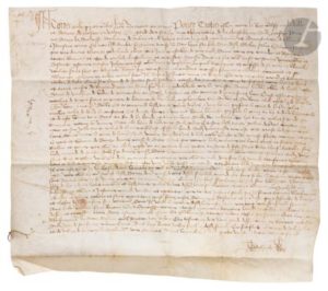 [CHARTE]. [OISE]. [CRÉPY-EN-VALOIS] Confirmation de dette sur des terres sises au « terroir de Haramoult » dues par Jehan Godechault, abbé prémontré de Notre-Dame de Valsery (diocèse de Soissons) à Jean Prevost, prêtre de Pisseleu (Oise). En français, acte sur parchemin, passé devant Thomas Godechault « clerc comis juré et estably par madicte dame ». France, Crépy-en-Valois, 18 avril 1483. Dimensions : 340 x 270 mm (sans le repli). Bon état général. Analyses anciennes au dos, en partie effacées. Incipit : « A tous ceulx qui ces presentes lectres verront ou orront. Ponce Trotin esleu pour le Roy Nostresire en la ville … de Crespy en Valois et garde des seaulx aux obligacions de la chastellenie dudit Crespy pour ma dame la duchesse d’Orleans, de Milan et de Valois, aiant la garde, gouvernement et administracion de treshault et trespuisant prince et mon tresredoubté seigneur Monsieur le duc Loys son filz duc desdictz duché salut… ».