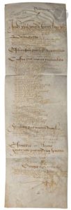 [CHARTE]. [GASTRONOMIE]. [BOURGOGNE]. [CHARLES QUINT] Etat de maison pour le jeudi 27 juin 1518. En français, acte sur parchemin. Espagne, Saragosse, daté 27 juin 1518, signé « Boisot ». Incipit : « Jeudi .xvii.e jour de juing l’an XVc .xviiiv. le roy de Castille, de Leon, de Grenade, d’Arragon, archiduc d’Austrice, duc de Bourgongne, de Brabant…en sadicte ville de Sarragosse […] livres quarante groz monnoye de Flandres ». Suivent les catégories de dépenses liées à la maison de Bourgogne et la cour itinérante installée à Saragosse, avec les sommes dues et les noms des pourvoyeurs : Panneterie / Eschansonnerie par le Seigneur de Corrieres / Cuisine par Jaques Ymbrechts / Fruiterie par Marck de Coche / Fourriere par Andres Spierinc / Gaiges Rare témoin d’un état de maison, présentant un intérêt pour le fonctionnement de la cour de Charles Quint et notre connaissance sur les services de bouche et cuisine. En 1518, le titre de « Roi de Castille, de Leon, de Grenade…duc de Bourgogne » est porté par Charles de Habsbourg (1500-1558), qui sera élu empereur Charles Quint en 1520. Il est héritier de quatre dynasties : petit-fils de la duchesse Marie de Bourgogne, de Maximilien d’Autriche, d’Isabelle la Catholique, reine de Castille, et de Ferdinand le Catholique, roi d’Aragon et de Naples, il est duc de Bourgogne sous le nom de CharlesII, roi des Espagnes sous le nom de CharlesIer (en espagnol Carlos I), mais est surtout passé à la postérité comme l’empereur romain germanique CharlesV. Dès 1517, Charles de Habsbourg effectue un voyage en Espagne (voir L. Vital, « Relation du premier voyage de Charles-Quint en Espagne, de 1517 à 1518 », in L.-P. Gachard, Collection des voyages des souverains des Pays-Bas, III, Bruxelles, 1808, p. 1 et suivantes). Parmi les officiers et pourvoyeurs, on relève Andres Spierinc, membre d’une famille importante au service des ducs de Bourgogne. Signalons par exemple « Nicolas Spierinc, calligraphe et enlumineur des Ordonnances des Etats de l’Hôtel de Charles le Téméraire » (A. de Schryver, in Scriptorium, 1969 (23-2), pp. 434-458). Sous l’intitulé « Cuisine » on trouve la longue liste des pièces de boucherie et leur coût : « massin bouchier pour .vii. moutons .viii. l[ivres] / A lui pour demi veau .lxxi. s[ous] .v. d[eniers] / A lui pour une teste pietz et couee de veau .x. s[ous] .vi. d[eniers]… ». Sous la rubrique « Gaiges » sont donnés les noms des divers officiers dont les maîtres d’hôtel du duc de Bourgogne : « Somme du jour comprins gaiges […] Don Diego de Ghevarre… Anthoine de la Barre, George Hacqueney, Guillaume de Rolle et don Joan de la Coeve aussi maistres d’hostel ». On reconnait ici Diego de Guevara, Guillaume de Rolle ou encore Juan de la Cueva. Don Diego de Guevara (vers 1450-1520) fut un courtisan et ambassadeur espagnol qui servit les ducs de Bourgogne successifs, couvrant les dynasties des Valois et des Habsbourg, principalement aux Pays-Bas. Il fut également un important collectionneur d’art. L’acte est signé Pierre Boisot qui fut seigneur de Huysinghe et de Rouha, trésorier de l’ordre de la Toison d’or et des finances du roi aux Pays-Bas (voir G. De Boom, « L’établissement d’une famille bourguignonne, les Boisot, aux Pays-Bas, aux XVe et XVIesiècles », dans Intermédiaire des Généalogistes, 1952, pp. 20-25). Voir : J.-M. Cauchies, Finances et financiers des princes et des villes à l’époque bourguignonne, Turnhout, 2004.