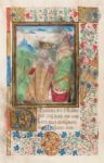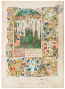 [ENLUMINURE] Feuillet extrait d’un livre d’heures. Prière à Acacius et ses compagnons martyrs. Acacius et ses compagnons martyrs. Donateur en prière. En latin, feuillet enluminé sur parchemin. Nord de la France ou Belgique?, vers 1460-1480. Dimensions : 124 x 88 mm Représentation peu courante de la scène du Martyre d’Achacius et de ses 10.000 compagnons. Ils sont crucifiés ou empalés sur des arbres et des épines. Texte : « Christus miles achaaus deos.. » ; au verso, « Concede quesumus omnipotens…ab omni peste epyderme… ». Note au crayon au dos : « Les empalés » : une version de la légende stipule que les martyrs sont précipités du haut d’une montagne vers des arbres épineux dont les branches les transpercent et ils sont donc « empalés ». Joint : Feuillet extrait d’un livre d’heures, Psaumes de la Pénitence. David en pénitence. France, Normandie?, vers 1500. Visage frotté et gratté; nombreuses taches. Dimensions : 175 x 114 mm