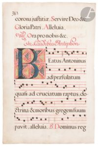 [ENLUMINURE]. Feuillet extrait d’un antiphonaire En latin, manuscrit décoré sur papier. Encre brune et rouge, aquarelle. France, XVIIe siècle. Dimensions : 440 x 285 mm Grande initiale B décorée (motifs géométriques). Grand feuillet extrait d’un antiphonaire avec antienne pour laudes, messe en l’honneur de saint Antonin (au verso, p. 342). Au recto (p. 341), troisième répons pour messe ou suffrage en l’honneur de saint Antonin.