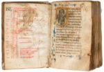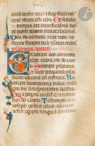 [MANUSCRIT]. Psautier férial, précédé d’un calendrier à l’usage de Bologne En latin, manuscrit enluminé sur parchemin. Italie, Bologne (Emilie-Romagne) (?), vers 1300-1325. Avec 8 initiales historiées et 6 initiales ornées. 186 ff., précédés de 2 ff. de gardes de parchemin et suivis d’un feuillet de garde de parchemin (remploi), complet [collation : i6, ii12, iii12, iv12, v12, vi12, vii12, viii12, ix12, x12, xi12, xii12, xiii12, xiv12, xv12, xvi12], écriture arrondie gothique (littera bononiensis), texte sur une colonne, 18 lignes par page, réclames, foliotation ancienne en chiffres romains, rubriques en rouge, initiales peintes en alternance en bleu ou en rouge, initiales peintes en rouge ou en bleu avec décor filigrané à l’encre bleue ou rouge, se prolongeant dans les marges, décor filigrané parfois rehaussé de vert, six initiales décorées (3 lignes de hauteur) en rose sur fond bleu, avec décor végétal coloré (palette rose, vert, orangé) avec prolongation dans les marges (ff. 153, 155v, 158v, 162, 165, 181), huit initiales historiées (palette identique) avec grande initiale B du « Beatus vir » (7 lignes de hauteur) sur fond d’or, avec prolongations dans les marges, les autres initiales historiées plus petites (4 lignes de hauteur), en rose sur fond bleu avec rehauts blancs, prolongations dans les marges avec parfois des motifs de grotesques ou anthropomorphes. Quelques frottements aux initiales historiées (notamment la première, initiale B du « Beatus vir », fol. 7 avec feuillet taché ; frottement aussi à l’initiale D « Dixit dominus » (fol. 132v)). Tache et traces d’encre au fol. 6v. Reliure de basane, sur ais de bois, plats estampés à froid avec triple filets formant un motif croisé, dos à 3 nerfs, reste d’un fermoir [lacunaire] (reliure accidentée, manque de cuir au dos, plats frottés, quelques trous de vers sur les plats, impactant les premiers feuillets). Dimensions des feuillets : 145x 95 mm ; dimensions de la reliure : 147 x 100 mm Provenance : 1. Manuscrit copié en Italie, dans la région d’Emilie-Romagne sur des bases stylistiques. Les huit initiales historiées et les six initiales ornées sont réalisées dans un style proche de celui que l’on nomme « primo stile », adopté dans les ateliers bolognais de la fin du XIIIe et du début du XIVe siècle, entre art Roman et nouvelle esthétique gothique. Sur ce « primo stile » bolognais, voir T. Kennedy (ed.), Medieval Bologna : Art for a University City, Londres, 2021. D’un point de vue liturgique, on relève dans le calendrier de ce Psautier un certain nombre de saints locaux, honorés à Bologne. Signalons tout particulièrement : Procolus (01.06) ; Vital et Agricole de Bologne, deux premiers martyrs de Bologne (04.11) [Chiesa dei Santi Vitale e Agricola in Arena ; Eglise Saint-Vital-saint-Agricol dans le complexe stéfanien de Bologne] ; Pétrone de Bologne (04.10), saint patron de la ville de Bologne, Basilique San Petronio de Bologne ; Etienne (01.01 et 26.12) [Basilique Santo Stefano] ; Etienne, pape (02.08) ; Venant, abbé (2 fois : 11. 10 ; 23.10). Aux XIIIe et XIVe siècles, Bologne est un centre intellectuel abritant la plus ancienne université d’Europe : la ville devient le premier centre de production de manuscrits en Italie avec une communauté florissante de scribes, d’artistes, d’érudits et de libraires. 2. France, collection particulière. Texte : ff. 1-6v, Calendrier, en latin, encre rouge et brune (voir ci-dessus pour le relevé des saints suggérant une origine bolognaise). ff. 7-169, Psautier férial (psaumes 1 à 150), divisé en huit parties selon les divisions fériales, comme il est coutumier (psaumes 1, 26, 38, 52, 68, 80, 97, 109). Il est courant que les psautiers fériaux comprennent un cycle de huit miniatures ou initiales historiées. Le psautier dit « férial » est divisé en livres correspondant à la récitation de l’Office divin. Une main ancienne indique dans la marge supérieure les féries liturgiques concernées. Une numérotation ancienne des psaumes en chiffres arabes est rajoutée dans les marges (« 150 » dans la marge du fol. 169). ff. 169-186v, Prières et cantiques, dont « Confitebor tibi domine… » (fol. 169) ; Benedictus (ff. 179-181) ; Canticum sancte marie virginis (ff. 181-181v), « Magnificat anima mea dominum... » (Luc 1, 46-55) ; Nunc dimittis (ff. 181v-182) ; Pater noster ; Credo ; dernière prière : « Quicumque vult salvus est… ».On notera que les rubriques (systématiquement « Psalmus David ») semblent en partie erronées à partir du fol. 169v. Illustration : Ce manuscrit contient 8 initiales historiées. On trouve aussi 6 initiales ornées aux feuillets153, 155v, 158v, 162, 165, 181. f. 7, Initiale B historiée, Psaume 1 “Beatus vir”, Roi David (registre inférieur) et Christ nimbé (registre supérieur) [initiale frottée]. f. 32, Initiale D historiée, Psaume 26 “Dominus i