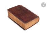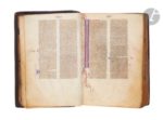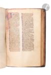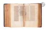 [MANUSCRIT]. [BIBLE]. Ancien Testament ; Nouveau Testament ; Interprétation des noms hébraïques. En latin, manuscrit décoré sur parchemin. Espagne, Royaume de Castille (Séville ?), vers 1250-1275. 375 ff., avec les quatre premiers feuillets blancs et réglés différemment du reste du manuscrit, première page écrite (fol. 5v), parchemin très fin et préparé avec soin (préparation du parchemin du type de celle pratiquée en Europe du Sud), manuscrit complet (collation impraticable, reliure ancienne serrée, quelques réclames par exemple ff. 341v, 357v signalant une composition en cahiers de 14 et de 16 ff.), écriture gothique très abrégée (plusieurs mains d’un même atelier) à l’encre brune, une main distincte pour l’Interprétation des noms hébraïques (ff. 328-374v), manuscrit à grandes marges, texte copié en deux colonnes (jusque 58 lignes par colonne), réglure à la pointe sèche, rubriques en rouge, titres courants en rouge et bleu dans la marge supérieure, chapitres bibliques signalés en chiffres romains et reportés dans les marges, certaines majuscules rehaussées de rouge dans le texte (ces majuscules sont parfois manquantes dans le texte, signe que le rubricateur n’a pas terminé son travail, par exemple colonne de gauche, fol. 254), nombreuses initiales peintes (2 à 4 lignes de hauteur) en bleu ou en rouge avec décor filigrané en rouge ou en bleu clair introduisant les changements de chapitres bibliques reportés dans les marges extérieures des feuillets (et non pas inclus dans la justification du texte), plus grandes initiales peintes en rouge ou en bleu avec décor filigrané de couleur opposée plus développé se prolongeant dans les marges (5 à 15 lignes de hauteur) introduisant les grandes divisions textuelles (prologues et changement de livres bibliques), on notera que la grande initiale peinte en rouge du « Frater Ambrosius » (fol. 6) se prolonge sur 36 lignes de texte, aussi la grande initiale peinte en bleu du « In principio creavit deus… » (début du livre de la Genèse) avec décor filigrané rouge et rehauts aquarellés verts (fol. 8) se prolonge sur 45 lignes de texte, grande initiale ‘L’ peinte en rouge avec décors ornementaux ajourés et décor filigrané bleu clair introduisant le commencement de l’Evangile selon saint Mathieu (fol. 260), initiale un peu différente pour introduire l’Interprétation des noms hébraïques (fol. 328) de type ‘puzzle’ en rouge et bleu avec décor filigrané rouge et bleu (le bleu plus foncé, différent du reste des décors filigranés en bleu pâle). Reliure gothique de la fin du XIVe ou XVe siècle, veau estampé à froid, veau havane sur ais de bois, dos à 6 nerfs ponctué de fleurons et filets à froid, décor aux petits fers répétés (fer avec pélican mystique et les lettres LIDA, répété dans l’encadrement extérieur ; fer au lapin ou lièvre ; fer à l’animal hybride ou griffon), encadrements et panneaux multiples séparés par des filets multiples à froid, tranches dorées, inscription à l’encre sur la tranche : “Biblia manuscripta.” Cette reliure peut être rapprochée d’une reliure renfermant également une Bible du XIIIe siècle et conservée à Milan, Bibliotheca Braidense, AD.XII. 45, dite de facture française. Quelques restaurations à la reliure, quelques épidermures, bel état intérieur (quelques initiales faiblement maculées, par exemple fol. 73v), quelques plis au parchemin (un peu plus prononcés aux ff. 115-132 dans les coins supérieurs), quelques traces de galeries de vers mais sans gravité. Boite de conservation moderne. Dimensions des feuillets : 175 x 115 mm ; dimensions de la reliure : 182 x 120 mm Rare témoin d’une Bible portative réalisée à l’époque du règne d’AlphonseX le Sage (Alfonso el Sabio) (1221-1284) qui accède au trône en 1252. Ce manuscrit présente le type de décor filigrané vermiculé (voir Avril et alia, 1982) à mettre en relation avec les manuscrits bibliques réalisés sous le règne ou dans l’entourage d’AlphonseX le Sage dans la seconde moitié du XIVe siècle. Les petites Bibles portables contenant le texte complet de l’Ancien et du Nouveau Testament constituent l’une des grandes innovations du XIIIe siècle, développées dans les milieux des prédicateurs dominicains et franciscains. Les premières Bibles portatives (en anglais, « pocket Bibles ») ont peut-être été copiées à Paris à la fin des années 1220 ou au début des années 1230 (voir les travaux de Laura Light et Chiara Ruzzier). Des exemples espagnols de ce type de Bible apparaissent assez tôt (Paris, BnF, n.a.l. 836 est daté de 1240), mais à ce jour il n’existe aucune étude complète consacrée aux Bibles latines du XIIIe siècle en Espagne. Dans une étude récente de Chiara Ruzzier sur les Bibles portatives du XIIIe siècle, basée sur un échantillon très complet de manuscrits survivants, seulement 3 % des Bible