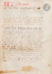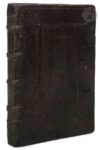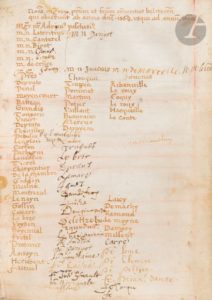 [MANUSCRIT]. [OISE]. [BEAUVAIS]. Nécrologe du couvent des Cordeliers (franciscains) de Beauvais En latin et en français, manuscrit décoré sur parchemin. France, Beauvais, 1552-1694. 60 ff., précédés d’un feuillet de garde de parchemin, contre-gardes anciennes, écritures cursives multiples, inscriptions d’une main circa 1600 sur la contregarde supérieure et au recto du premier feuillet, écriture d’un module plus grand pour annoncer chaque journée recensée dans le nécrologe, lettres KL et noms des mois à l’encre rouge, parchemin épais avec des réglures diverses suggérant que le parchemin est en fait du parchemin de remploi, déjà réglé. Reliure de plein veau brun foncé, décor estampé à froid (reliure du XVIe siècle), dos à 4 nerfs (quelques restaurations anciennes), cuir sur les plats craquelé par endroits, mais néanmoins bon état général. Quelques taches et effacements de certains obits (ff. 1, 9, 24v, 33v, 41, 56v), parchemin coupé dans la partie supérieure mais sans manques aux ff. 38-39. Dimensions des feuillets : 205 x 150 mm ; dimensions de la reliure : 215 x 155 mm Témoignage émouvant des enregistrements des morts au sein du couvent des Cordeliers de Beauvais. On relève les nombreuses entrées et obits pour la famille Loysel, très liée au Couvent des Cordeliers, comme bienfaiteurs et dont plusieurs membres ont choisi le couvent comme lieu de sépulture. La famille Loysel est importante au XVIe siècle pour le Beauvaisis et la ville de Senlis. Sont consignés dans un calendrier pour chaque jour, introduit par la phrase : « Hac die mortuus est… » ou « Ista die defunctus est frater… », les morts que pleure le couvent, des frères, des prieurs mais aussi des personnalités proches du couvent, des laïcs donateurs. Par exemple on trouve des dons précisés par exemple celui de Philippe Camus : « Philippus Camus doctor Rhemiensis ac huius conventus bis gardianus qui dedit casulae pulcherime et calicem argenteum…sepultus est autem in choro ante imaginem divi mauritii anno 1599 » (f. 4) ou encore celui de Firmin de Marcelle : « Firminus de Marcelle doctor Rhemensis…Le couvent a reçue de luy un calice d’argent dorée et deux petites burette… » (f. 14), ou encore de Toussaint La Gache : « Toussanus La Gache sacerdos qui dedit ymagines virgine marie de dormitorio et claustro… » (f. 29). On trouve dans ce nécrologe de nombreuses références à la famille Loysel, importante famille du Beauvaisis, seigneurs de Quévremont, de Flambermont, d’Exonviller et autres lieux. Quatre membres de la famille Loisel ou Loysel occupent successivement à Senlis la charge de Lieutenant général au batillage de 1558 et 1673. On relève Marie de Cornouaille, femme de Odel Loyseau dont l’obit indique : « Le 20e may est deceddée damoiselle Marie de Cornoaille femme de monsieur nostre père spirituel et bienfacteur de ce couvent Odel Loysel escuier seigneur de Flambermont, de Senesfontaines et d’Esonviller, conseiller du roy et president a Senlis mil vinq cens quatre vingt seize et est enterrée en la chappelle dicte des oyseaulx » (f. 24). Autre personnage important de la famille, Claude Loysel, seigneur de Flambermont : « Nobilis vir et pater spiritualis hujus conventus et benefactor Claudius Loysel, scutifer et dominus de Flambermont… 1568 » (f. 21v). Claude Loisel de Flambermont (vers 1520-1568) est né à Beauvais paroisse Saint-Sauveur. Écuyer, conseiller du Roi, il est élu en l’élection de Beauvais, seigneur de Flambermont et de Senéfontaine. Il est inhumé aux Cordeliers auprès de son père et de sa mère. Il épouse vers 1544 Nicole de Nully, fille de Pierre de Nully (1488-1549), maire de Beauvais en 1543. Celle-ci figure d’ailleurs dans le présent Nécrologe : « Ce jour 20e octobre mil VC IIIIxx sept et [sic] deceddée de bonne mémoire Collecchon de Nully vesve de feu nostre père sprituel noble homme Claude Loysel escuier seigneur de Flambermont, Senesfonteines… » (f. 48v). D’autres membres de la famille Loysel figurent dans le Nécrologe : Jean Loysel, premier médecin du roi Louis XII et de François Ier : « Hac die 18 obiiit nobilis vir et pater spiritualis huius conventus et benefactor Joannes Loysel dominus d’Esomviller et de Belloy anno 1558 » (f. 39). Jean III Avis Loysel est premier médecin des rois Louis XII (1498-1515) et François Ier (1515- 1547). Louis XII le nomme maître et administrateur de la Maladrerie de Saint-Lazare de Beauvais de 1503 à 1519. Loysel est médecin des boursiers du collège de Cluny. C’est lui qui, le premier, fait accorder aux médecins ordinaires des rois et princes du sang le privilège d’exercer leur art dans Paris, même s’ils ne sont point docteurs. Citons enfin aussi Nicolas Avis dit Loysel, échevin de Beauvais en 1512, fils de Jean Loysel, régent et doyen de la Faculté de médecine de Paris, premier médecin du roi Louis XII et de François Ier : « Nobilis