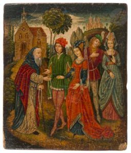 [ENLUMINURE NÉO-GOTHIQUE]. Ermite (saint Antoine abbé ?) distribuant des chapelets à des couples élégants Huile, gouache et or sur panneau de bois France, XIXe ou début XXe siècle. Attribuable au Faussaire espagnol, actif à Paris vers 1900-1930. Dimensions : 130 x 110 mm Ce petit tableautin est peint dans le « style troubadour » à la mode aux XIXe et au début du XXe siècle, dans l’esprit des nombreuses copies de modèles médiévaux qui circulaient alors, popularisés par des ouvrages tels ceux de Paul Lacroix (le Bibliophile Jacob) ou Ferdinand Seré contenant des reproductions chromolithographiques de costumes et scènes médiévales. Par son style, il rappelle les œuvres communément associées au « Faussaire espagnol » (Spanish Forger), un artiste démasqué par Belle da Costa Greene, conservateur de la Pierpont Morgan Library dans les années 1930. Le Faussaire espagnol est le nom de convention donné à un faussaire, peintre et enlumineur, actif à Paris à la fin du XIXe et au début du XXe siècle, connu pour ses nombreux faux d’art médiéval mais dont l’identité exacte n’est toujours pas établie malgré les travaux pionniers de William Voelkle. Ce tableautin ne figure pas dans l’ouvrage de référence William Voelkle et Roger S. Wieck, The Spanish Forger, New York, Pierpont Morgan Library, 1978. L’artiste peint sur des feuillets de parchemin détachés, des manuscrits anciens qu’il complète avec ses œuvres ou des petits tableautins de bois. On rappellera que cet artiste fut démasqué par Bella da Costa Greene lorsque l’on lui demanda de se prononcer sur un tableau figurant le Mariage de sainte Ursule offert au Metropolitan Museum et qu’elle émit les premiers doutes sur son authenticité (maintenant conservé à New York, Pierpont Morgan Library, 1988.125). Depuis les œuvres du Faussaire espagnol sont collectionnées et appréciées pour leur charme néo-gothique. En 2009, le Victoria and Albert Museum de Londres a acquis cinq tableaux du faussaire espagnol « pour ce qu’ils nous apprennent sur les perceptions du Moyen Âge à la fin du XIXe siècle ».