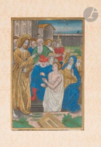 [HEURES]. Heures imprimées Gravure extraite d’un livre d’heures gravé et rehaussée en coloris d’époque Résurrection de Lazare (sans doute pour illustrer l’Office des morts) Impression sur parchemin, texte au dos en latin, imprimé. France, vers 1510-1520. Dimensions : 130 x 83 mm Série in-8° dessinée par l’enlumineur-graveur et imprimeur Jean Pichore pour les frères Hardouyn, vers 1510. Voir Tenschert et Nettekoven, Horae B. M. V., 158 Stundenbuchdrucke der Sammlung Bibermühle, 1490-1550.