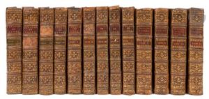 [COOK (Capitaine James)] – HAWKESWORTH (John). Relation des voyages entrepris par ordre de sa majesté britannique, actuellement régnante ; Pour faire des Découvertes dans l’Hémisphère Méridional, Et successivement exécutés par le Commodore Byron, le Capitaine Carteret, le Capitaine Wallis & le Capitaine Cook, dans les Vaisseaux le Dauphin, le Swallow & l’Endeavour : Rédigée d’après les Journaux tenus par les différens Commandans & les Papiers de M. Banks… Paris : Saillant et Nyon, Panckoucke, 1774. - Voyage dans l’hémisphère austral, et autour du monde, fait sur les vaisseaux de roi, l’Aventure, & la Résolution, en 1772, 1773, 1774 & 1775. Paris : Hôtel de Thou, 1778. - Troisième voyage de Cook, ou voyage à l’Océan Pacifique, ordonné par le Roi d’Angleterre, Pour faire des Découvertes dans l’Hémisphère Nord, pour déterminer la position & l’étendue de la Côte Ouest de l’Amérique Septentrionale, sa distance de l’Asie, & résoudre la question du passage au Nord. Exécuté sous la direction des Capitaines Cook, Clerke & Gore, sur les Vaisseaux la Résolution & la Découverte en 1776, 1777, 1778, 1779 & 1780. Paris : Hôtel de Thou, 1785.—13 volumes in-4, 248 x 196 : (2 ff.), iv, xvj pp, (1 f.), xxxij, 388 pp., 16 planches ; (3 ff.), 26 pp., pp 31-536, 16 planches ; (3 ff.), 394 pp., (1 f.), 17 planches ; viij pp., (1 f.), 367 pp., 3 planches (Relation) ; portrait, xij pp., pp. v-xliv, 460 pp., 17 planches ; viij, 432 pp., 17 planches (sur 20) ; viij, 374 pp., 21 planches ; viij, 413 pp., (1 f.), 7 planches, 1 tableau ; xij, 510 pp., (1 f.), 1 planche, 1 tableau (Voyage dans l’hémisphère austral) ; frontispice, (4 ff.), cxxxij, 437 pp., (1 f.), 22 planches ; (2 ff.), 422 pp., 14 planches ; (2 ff.), 488 pp., (1 f.), 32 planches ; (2 ff.), 552 pp., (1 f.), 19 planches, 1 tableau (Troisième voyage de Cook). —Veau marbré, triple filet doré en encadrement sur les plats, dos à nerfs orné, tranches marbrées (reliure de l’époque). Édition originale française des trois voyages de Cook. La traduction des deux premiers a été réalisée par Suard, celle du troisième par Demeunier. LE DERNIER VOYAGE DE DÉCOUVERTE ET LA PREMIÈRE EXPLORATION SCIENTIFIQUE. James Cook, célèbre navigateur anglais, apporta une contribution très importante à la connaissance du Pacifique grâce à ses nombreuses levées hydrographiques, révélant l’existence d’un hémisphère océanique. Au cours de sa première expédition, de 1768 à 1771, il découvrit l’archipel des îles de la Société, la Nouvelle-Zélande, les côtes orientales de l’Australie qu’on englobait jusqu’alors dans l’hypothétique continent austral. En 1772, lors de son second voyage, il visita les îles Marquises, les Nouvelles-Hébrides et la Nouvelle-Calédonie. La dernière expédition, de 1776 à 1779, avait pour but de trouver un passage entre l’océan Atlantique et l’océan Pacifique par le nord du continent américain. Il parvint à atteindre le détroit de Béring, mais, de retour dans les îles Sandwich, découvertes préalablement, il fut tué par des indigènes le 14 février 1779. Il recueillit les observations les plus précises et les plus complètes sur les pays qu’il visita. Le premier ouvrage contient la relation des quatre premières circumnavigations britanniques, par les explorateurs John Byron (1723-1786), Samuel Wallis (1728-1795), Philip Carteret (1733-1796) et James Cook (1728-1779). Elle fut composée par le littérateur anglais John Hawkesworth (1715-1773), qui avait été commissionné pour réaliser une synthèse de ces relations, suite à de nombreuses publications illicites. Le dernier tome du second voyage contient un intéressant « Vocabulaire de la langue des isles de la société », un extrait des Observations astronomiques de Wales et Bayly et enfin un discours sur la santé des gens de mer et les médecines employées lors du second voyage de Cook, par Pringle. REMARQUABLE ET FAMEUSE ILLUSTRATION GRAVÉE SUR CUIVRE COMPRENANT UN PORTRAIT ET 203 (sur 206) PLANCHES, de nombreuses dépliantes : cartes, faune, flore, scènes de genre, mœurs, antiquités, armes, etc. Parmi ces planches se trouve la grande Carte générale où l’on voit toutes les découvertes du Capitaine Cook qui manque parfois. On compte également trois tableaux dépliants. Cette iconographie célèbre a révélé au monde occidental, pour la première fois, certains types exotiques. Il manque les planches 19, 31 et 32 dans le second tome du second voyage. Il manque également les feuillets D2 et D3 (pages 27 à 30) dans le tome 2 de la Relation des voyages. Bon exemplaire en reliures de l’époque. Les 9 premiers volumes, correspondant aux deux premiers voyages, sont en reliure uniforme. Usures et manques à plusieurs coiffes malgré des restaurations, fentes et restaurations à plusieurs charnières et quelques épidermures. Plusieurs pièces de titre ou de tomais